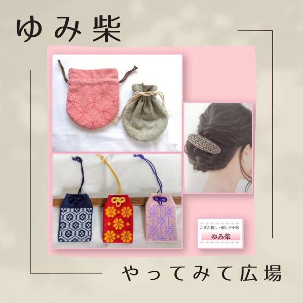 ぎん刺しお守り袋、こぎん刺しヘアアクセサリー、刺し子巾着など