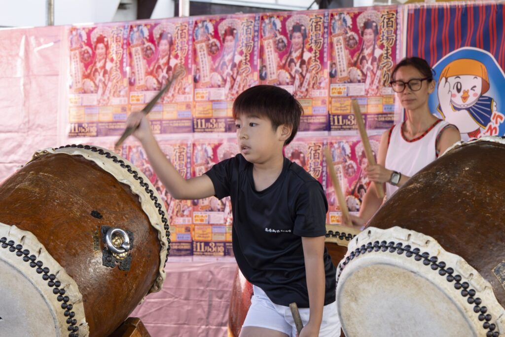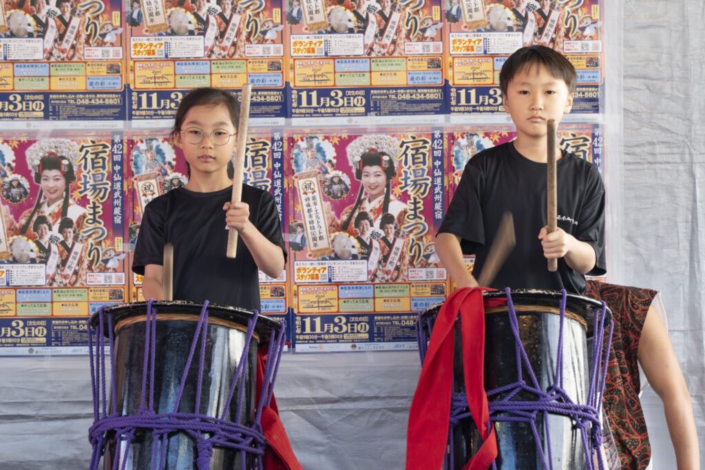 本陣演しもの(メインステージ)は、蕨宿本陣跡並びの宿場まつり会場中央に位置し、ここからカウントダウンが始まり、9時30分に宿場まつりがスタートします。「織姫、宿場小町の表彰式やその他にも、蕨少年少女合唱団、蕨市立第一中学校音楽部、蕨市立東中学校吹奏楽部、蕨市立第二中学校吹奏楽部、蕨ラグビースクール、YKJなどの演しものが行われています。地元 蕨南町太鼓の会からスタートです!」