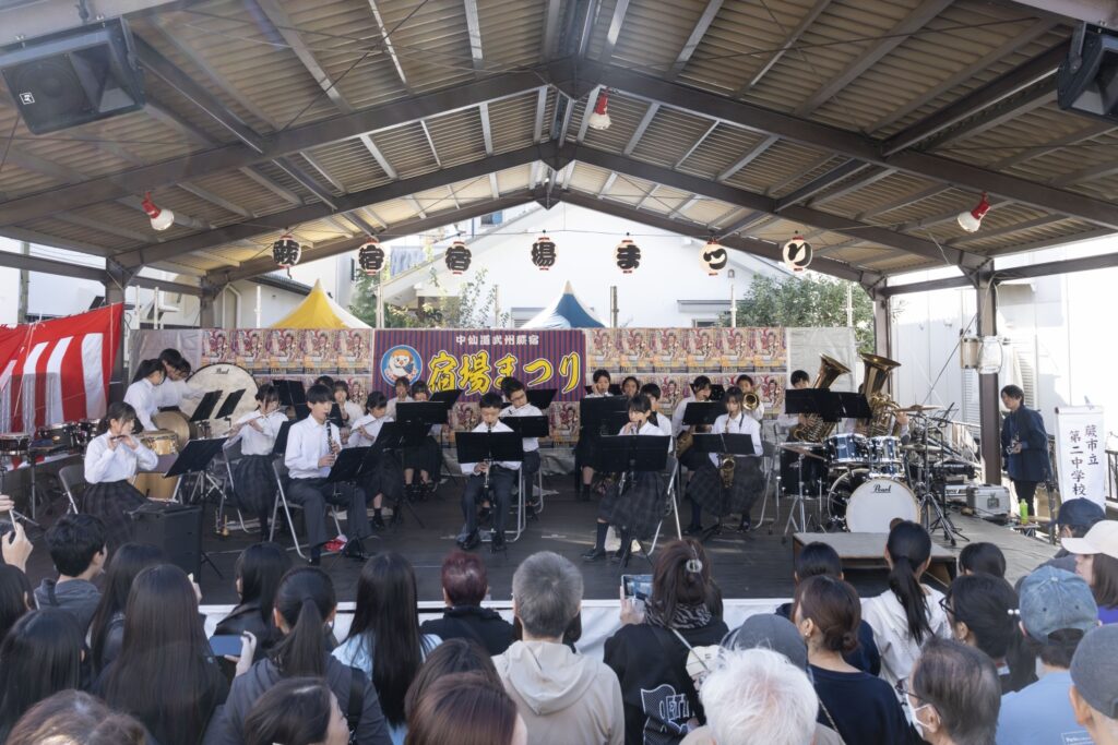こんにちは。蕨市立第二中学校吹奏楽部です。私たちは、コンクールや市民音楽祭などの地域のイベントなどで、良い音楽をお届けできるよう、日々楽しく活動しています。宿場まつり当日は24名で演奏させていただきます。ぜひ私たちの演奏をお楽しみください!