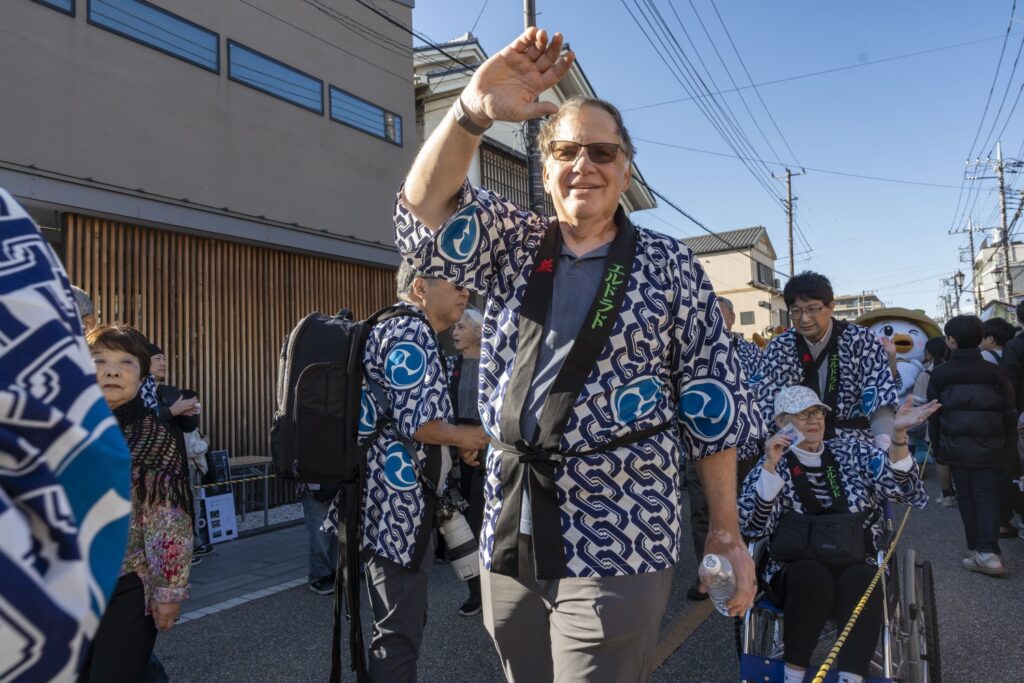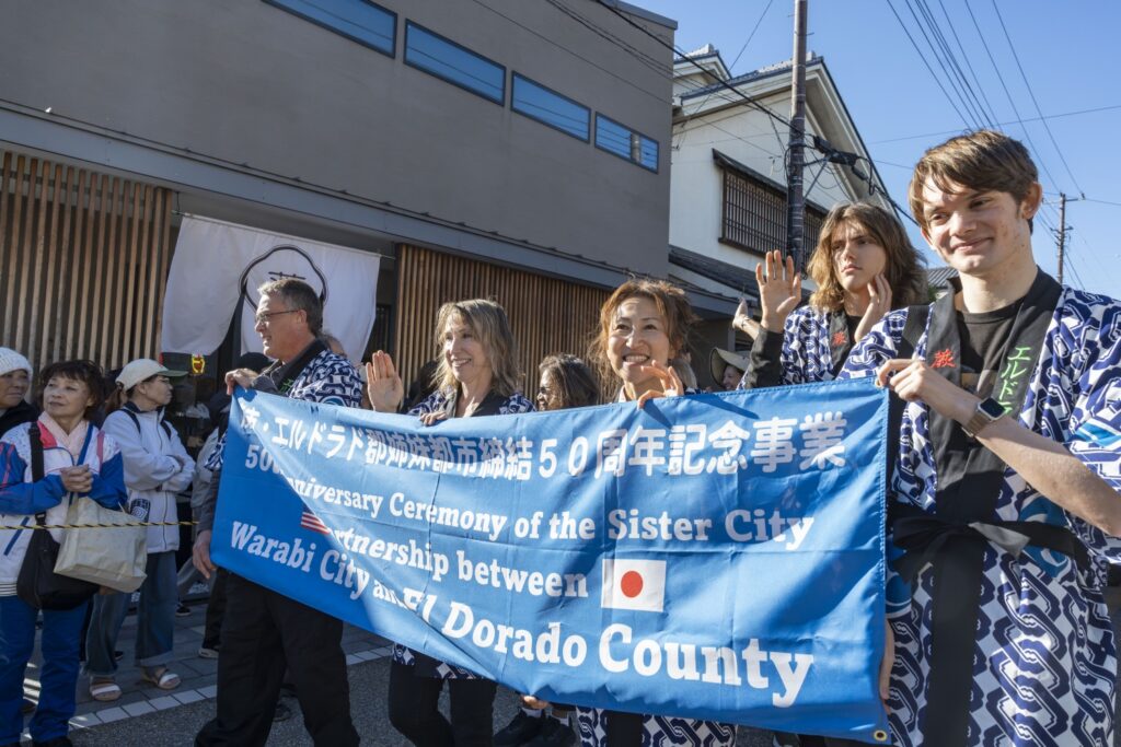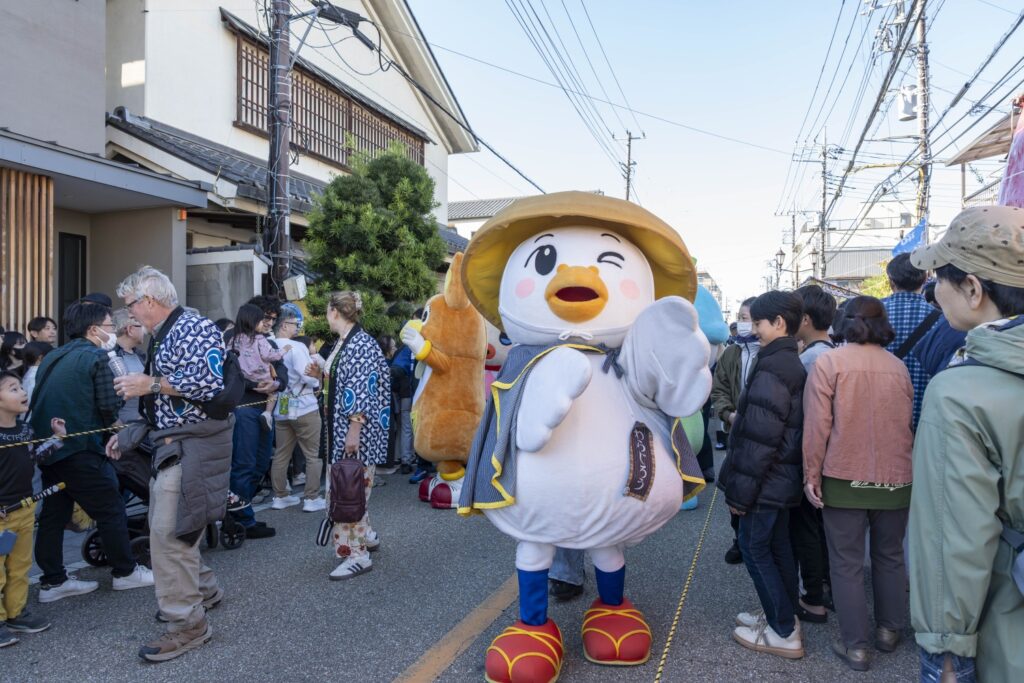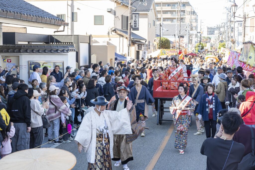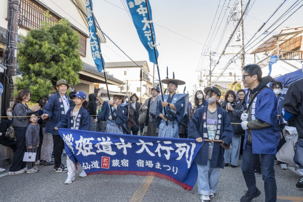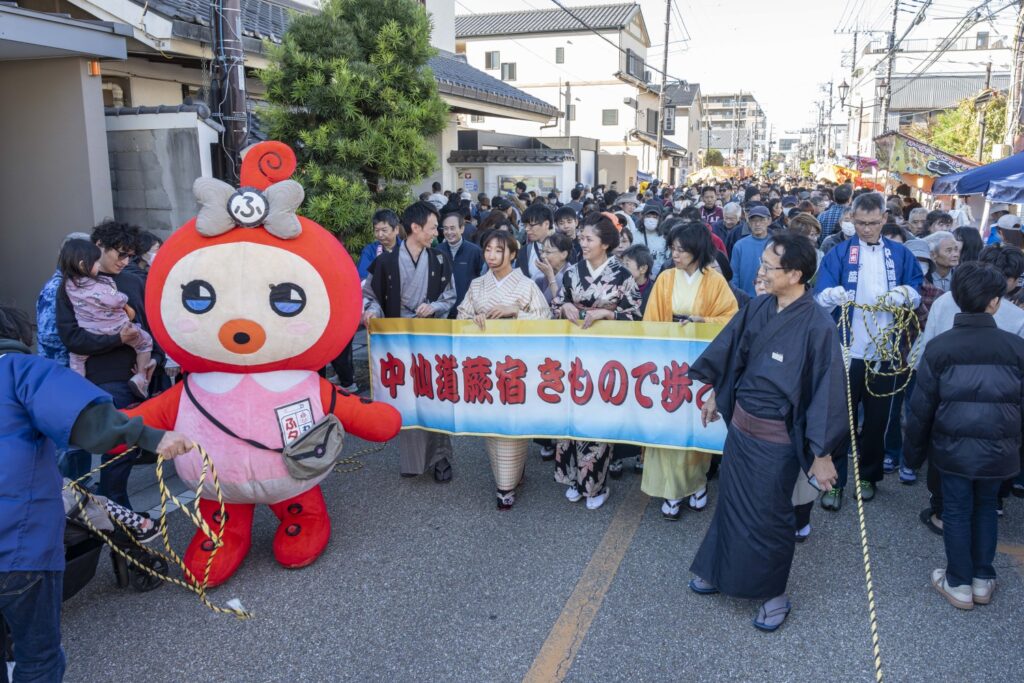 パレードには、頼髙秀雄蕨市長!!武将や家老、供侍が中山道を約1㎞に渉り大行列をしました。地元の公募で選ばれた、本年度『織姫』長谷川華菜愛さん・『宿場小町』豊澤環生さん・吉村幸菜さん、昨年度『織姫』小松 彩華さん・『宿場小町』徳竹 愛子さん・石井 こころさんが行列の中央に位置してパレードを華やかにしてくれています。また、この日が、初披露ということもあり織姫・宿場小町が現れると沿道からはたくさんの拍手や歓声が上がっていました。蕨を代表する”ゆるキャラ”『中仙道蕨宿マスコットわらじろう』『蕨市マスコットワラビーくん』『双子織マスコットふタコちゃん』『ウインクのマスコットキャラクターわらびーぬ』も駆けつけてくれました。そして、蕨市と姉妹都市締結50周年を記念して、アメリカ合衆国カルフォルニア州『エルドラド郡』からお越しくださいました皆様もオリジナルの半纏を着てパレードに参加、中仙道蕨宿きもので歩こう会の皆さん!今もなお宿場町の風情を残した景観の中で、着物を着た行列は中山道によく合います。パレードを見にきてくれた、たくさんのお子様たちが想いでに残るパレードで、1人でも未来の織姫や宿場小町になりたいと夢見て頂けたら『襷プロジェクト~つなぐ想い~』も大成功だと思います。そして,